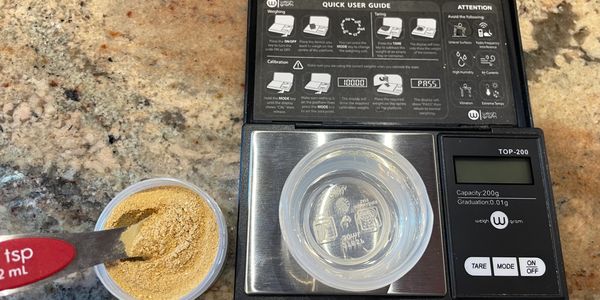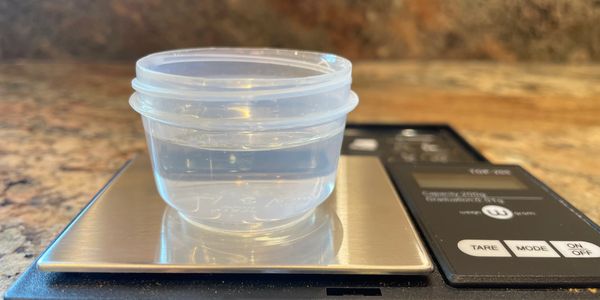 First, I add 1 tablespoon of water to a small plastic container and place the container on the scale before turning the scale on.