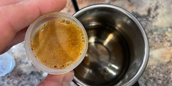 Before adding the mushrooms, I allow the water to stabilize at the desired simmering temperature. After transferring the contents into the tea kettle, I then add a small amount of water to the empty container, cover, and shake to rinse. I pour the rinse water into the tea kettle and repeat this process once more, ensuring all remaining contents are thoroughly transferred.